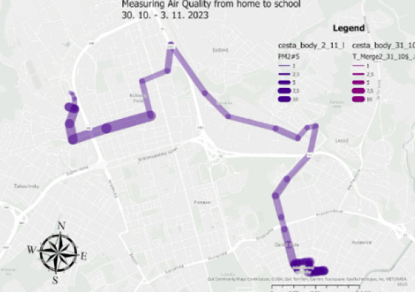 Obrázek 4 - Ukázka finální vizualizace naměřených hodnot kvality ovzduší na cestě z domu do školy.