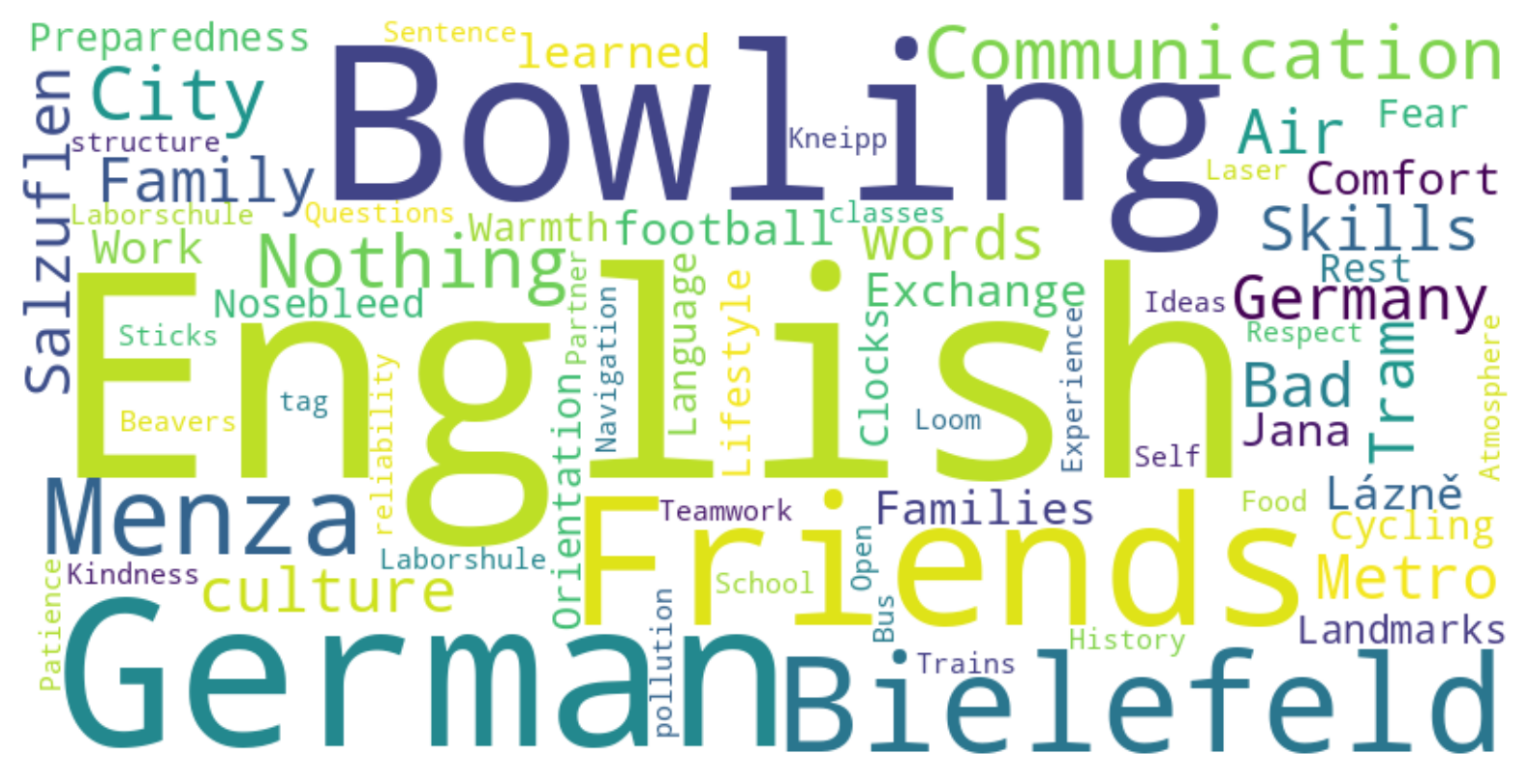 Obrázek 8 - Word cloud vytvořený ze zpětné vazby žáků z druhého projektového týdne v Bielefeldu na otázku What 3 things you learned during the project week?