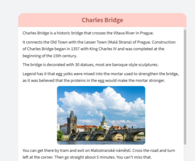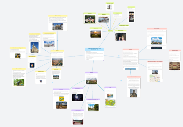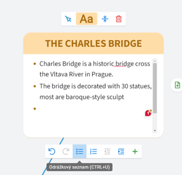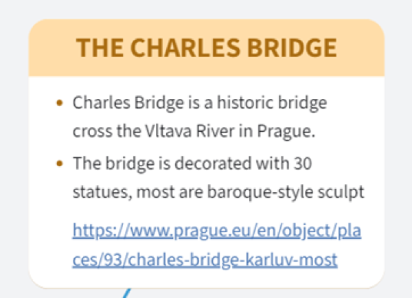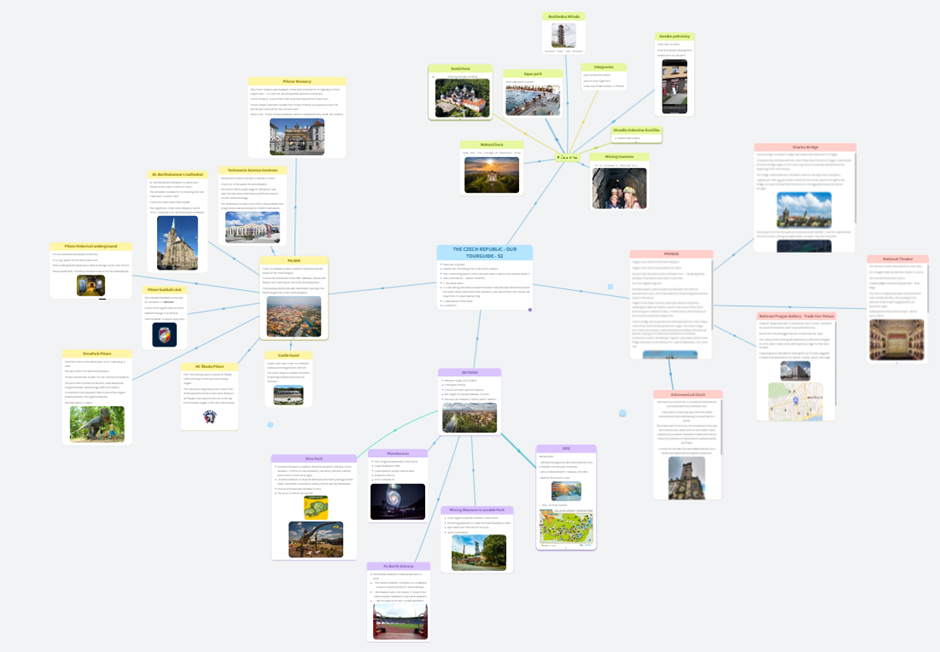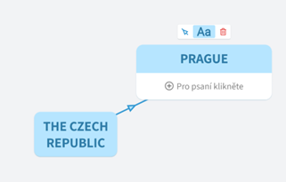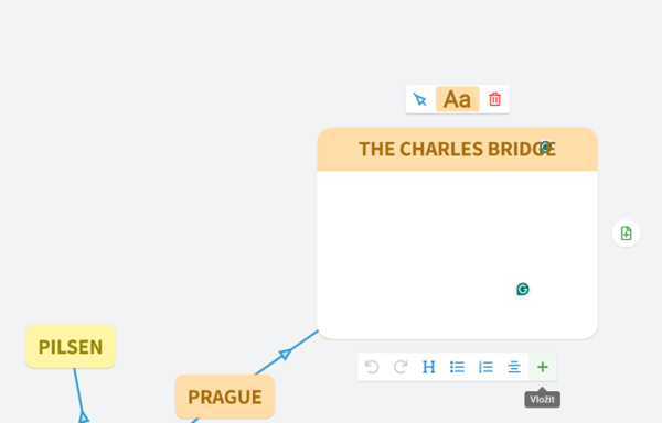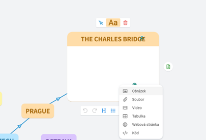 Každou oblast nyní rozpracujeme. Klikneme na šipku např. u PRAGUE a otevřeme si novou bublinu. Obarvíme ji stejnou barvou. Napíšeme název vybraného místa a rozklikneme okno. Do něj si postupně po vyhledání a úpravě informací vložíme minimálně tři věty a obrázek.