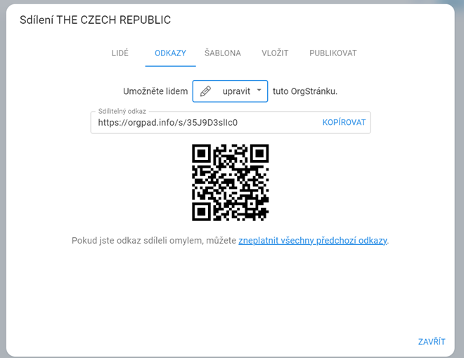 Pro práci budeme využívat digitální prostředí Orgpad. Všichni jste pozváni ke spolupráci. Učitel sdílí se studenty digitální prostor. Posílá odkaz, případně využije QR kód. Důležité je, aby zaškrtl možnost upravit – pro studenty. Opravňuje je tak, aby mohli v prostředí aktivně pracovat a vkládat do něj příspěvky.