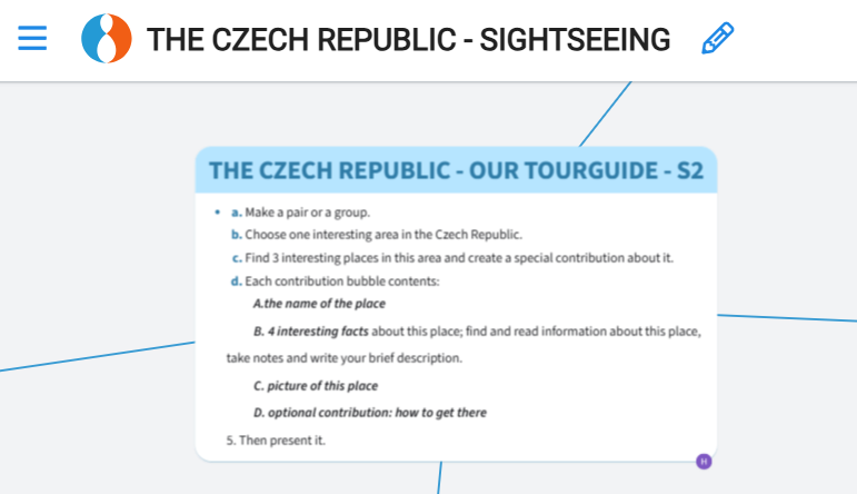 Kliknete-li na šipku, vytvoří se další bublina. Ta je pro vás klíčová. Promyslete nyní, jak budete pracovat (v jakých dvojicích, skupinách) a jakou oblast ČR si pro tvorbu průvodce vyberete. Následně si rozvrhněte, kdo jednotlivá místa ve vybraném městě či oblasti zpracuje dle zadání. Podmínkou je, aby každý zpracoval minimálně dvě místa.