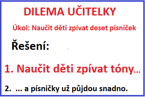 Paradoxně největším problémem tak zůstává přístup vyučující/ho. Veden/a dobrými úmysly (svoje děti jsem přece také naučil/a zpívat), snaží se stejným způsobem postupovat ve škole. Vývojové etapy hudebně nerozvinutých dětí ale nelze přeskakovat. Dobrý úmysl v tomto případě nestačí.