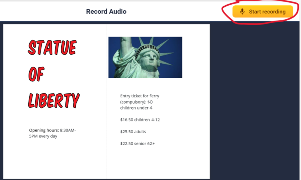 Poté co do knihy vloží šest památek, dva hotely, dvě restaurace a printscreen mapy, zkusí knihu namluvit pomocí nástroje „record“. To mohou udělat ve škole, pokud budova disponuje klidnými místy, kde lze nahrávat, nebo tuto část následně dodělají doma. Rozhodně doporučuji nahrávání nevynechávat, je skvělé, když se žáci mohou slyšet mluvit v cizím jazyce. Nahrávání spustí následujícím tlačítkem: