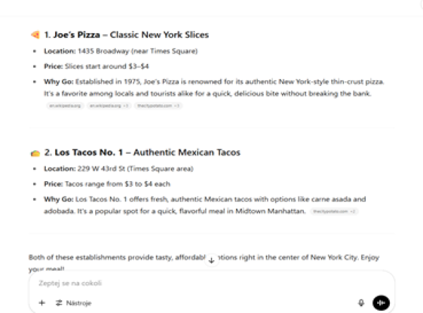 Dalším bodem je vybrat dva hotely a dvě restaurace. Možností je spousta, vedla bych žáky k tomu, aby se pokusili vybrat něco cenově dostupného, kde by se mohli ubytovat a najíst i se svou rodinou. V tomto případě mohou využít nabídky ChatuGPT: