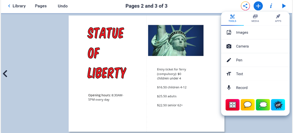 A poté na každou stránku připraví informace o jedné památce. Kromě názvu přiloží fotku či obrázek a praktické tipy. Aplikace je celkem jednoduchá na ovládání, žáci pouze kliknou na tlačítko + v pravém horním rohu a zde se jim ukážou všechny nástroje: