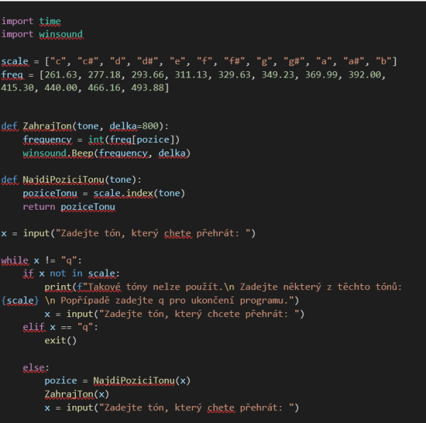 7. Nyní je potřeba, abyste změnili proměnnou „x“ tak, aby načetla vstup uživatele, a zároveň tento vstup ošetřili podmínkou, aby v případě chybného vstupu program vypsal hlášení, že takový tón není k dispozici. Zároveň je potřeba, aby nám program znovu nabídl možnost zadat další tón na přehrání.