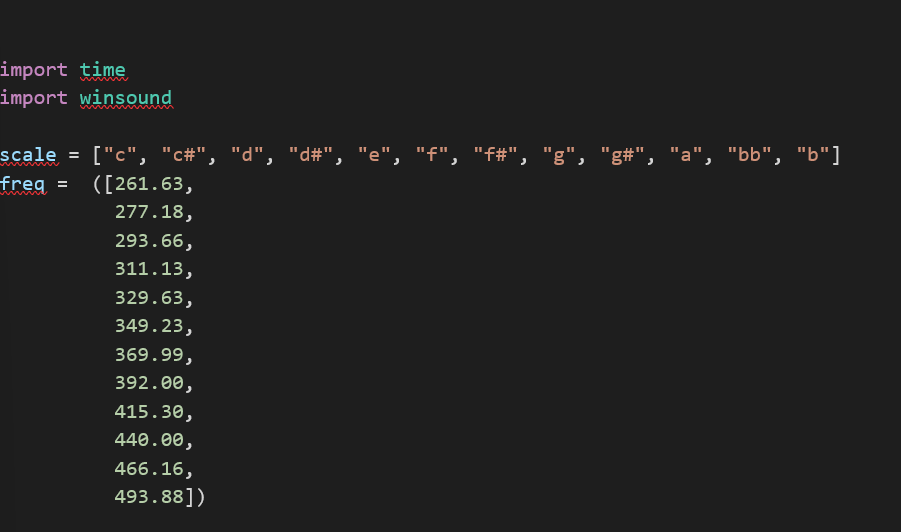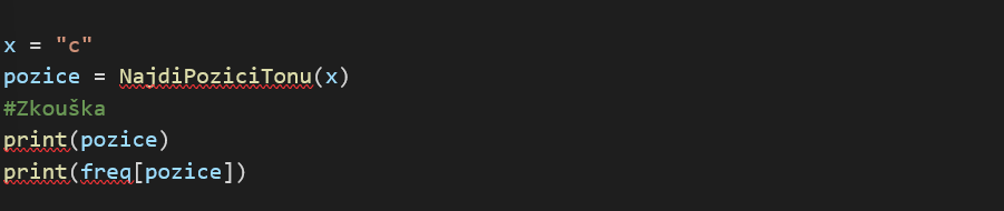 5. Když máme nadefinovanou funkci, která zjistí pozici indexu, můžeme tuto pozici použít pro proměnnou scale, ale i pro proměnnou freq, jelikož jsou frekvence seřazené do stejného pořadí jako tóny. Návratovou hodnotu si uložíme do proměnné a vykonáme zkoušku, zda funkce funguje správně: