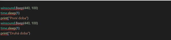 Máme zde již tři funkce. Stačí nám pouze tři funkce k tomu, abychom mohli takto zábavně interagovat s počítačem. Funkce winsound generuje tón na frekvenci 440 Hz o délce 100 milisekund. Funkce time nám vždy zmrazí program na jednu sekundu a poté pokračuje dále a vykoná funkci print, která vypíše text: „První doba“. Všimněme si, že funkce beep a sleep samostatně nefungují: