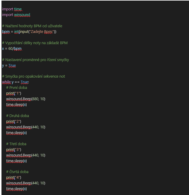 Cykly jsou základním stavebním kamenem každého programu. Ulehčují nám práci a díky nim nemusíme opakovat určité kusy kódu, které se neustále opakují. Můžeme tak vytvořit např. hudební pomůcku pro cvičení – metronom.