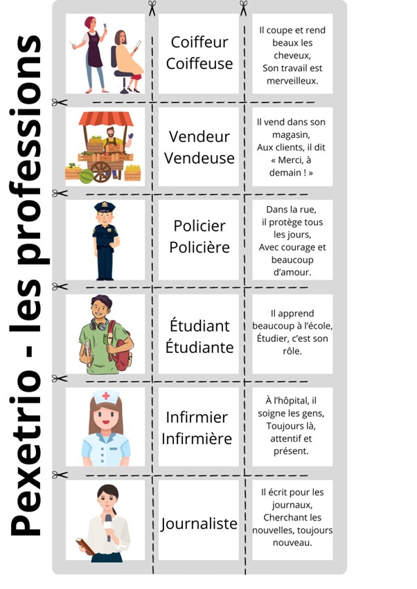 Před samotnou tvorbou hry pexetrio obeznamte žáky s krátkými medailonky (pokud zakryjete název, tak mohou posloužit jako hádanky) jednotlivých profesí. Jedná se o jednoduché básničky, které si společně přeložte, například pomocí mediačních aktivit – vyzvěte zdantnější žáky, aby spolužákům jednotlivá slovíčka ozřejmili, například pomocí angličtiny.