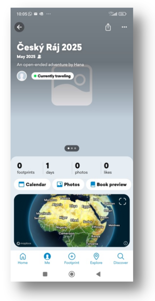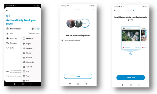 - Nyní můžeš přidávat „pingy“ – krátké příspěvky s polohou, fotkami a poznámkami pomocí tlačítka +New Footprint.