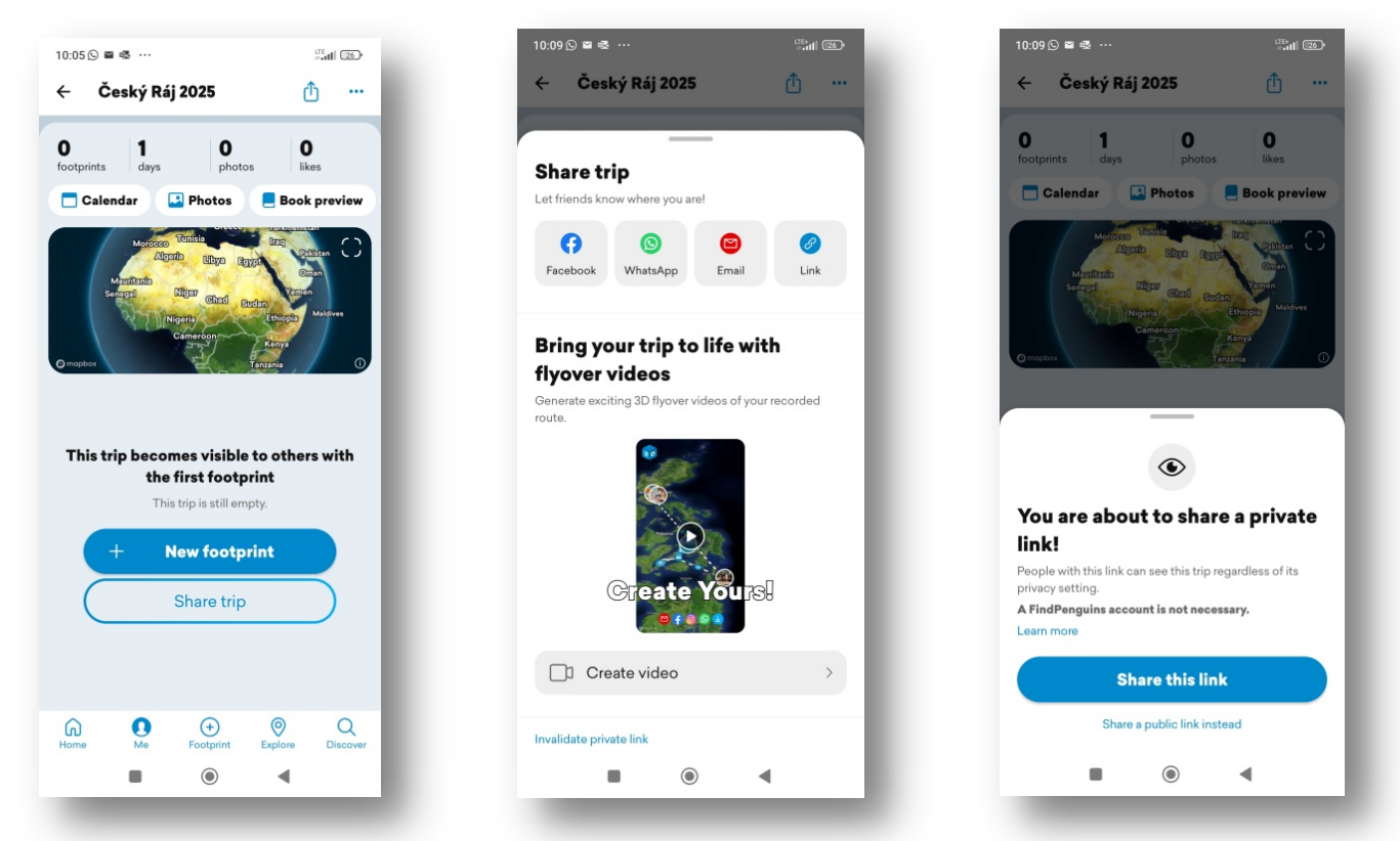 - Výlet pak můžeš sdílet pomocí tlačítka Share trip a dále Link a Share this link i lidem, kteří účet v této aplikaci nemají.