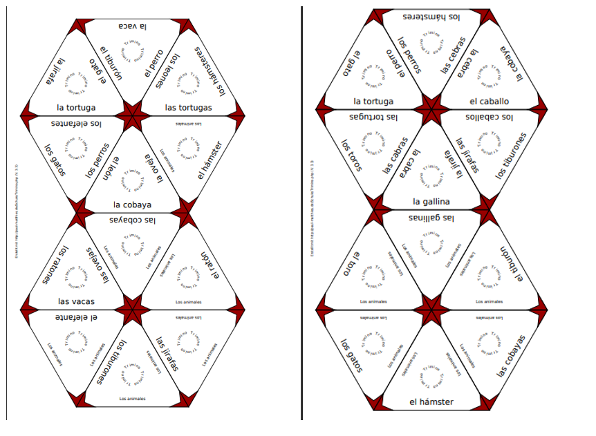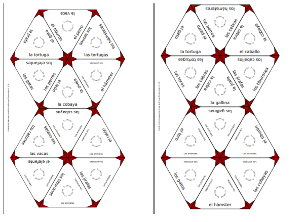 Žáci poté pracují ve čtveřici a hledají rozdíly ve svých triminech. Tvoří krátké dialogy: Qué hay en tu trimino? Reakce: Hay un elefante. Odpověď/reakce: Y tú…? Reakce: No hay un elefante, hay una gallina.