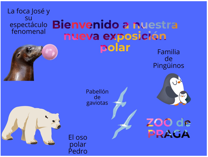 Žáci popisují výlet do zoo. Výhodou je, že si procvičí i starší slovní zásobu (tvoří věty: En el Zoo hay una exposición polar nueva con el oso polar Pedro…).