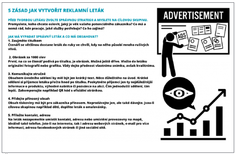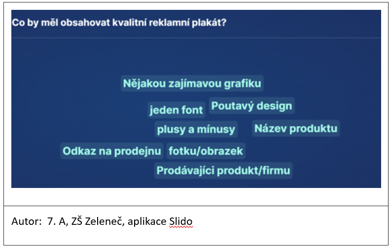 Je možné výtvory vytisknout a rozmístit po třídě, kdy si žáci namátkou vyberou prezentaci někoho jiného a popisují, co vidí na letáku; případně každý popisuje svůj.