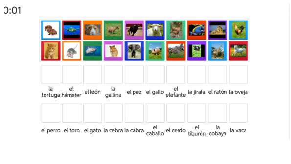 Žáci spojují obrázek a španělský název zvířete (můžete se pobavit o tom, která zvířata zní podobně i v jiných jazycích). Odkaz: https://wordwall.net/resource/93228044
